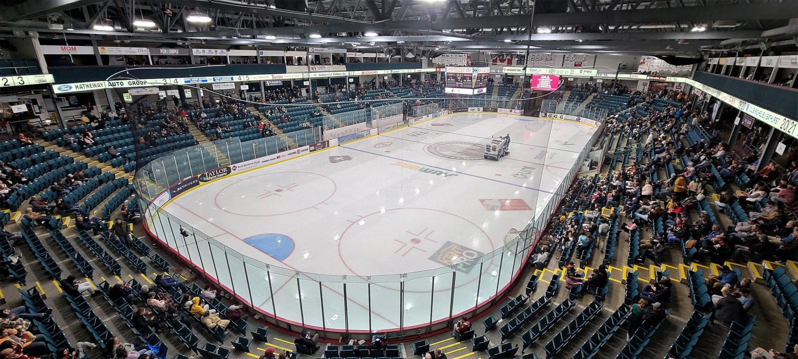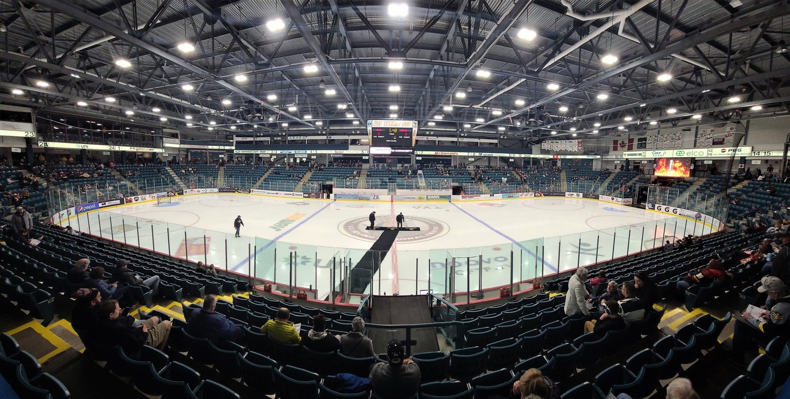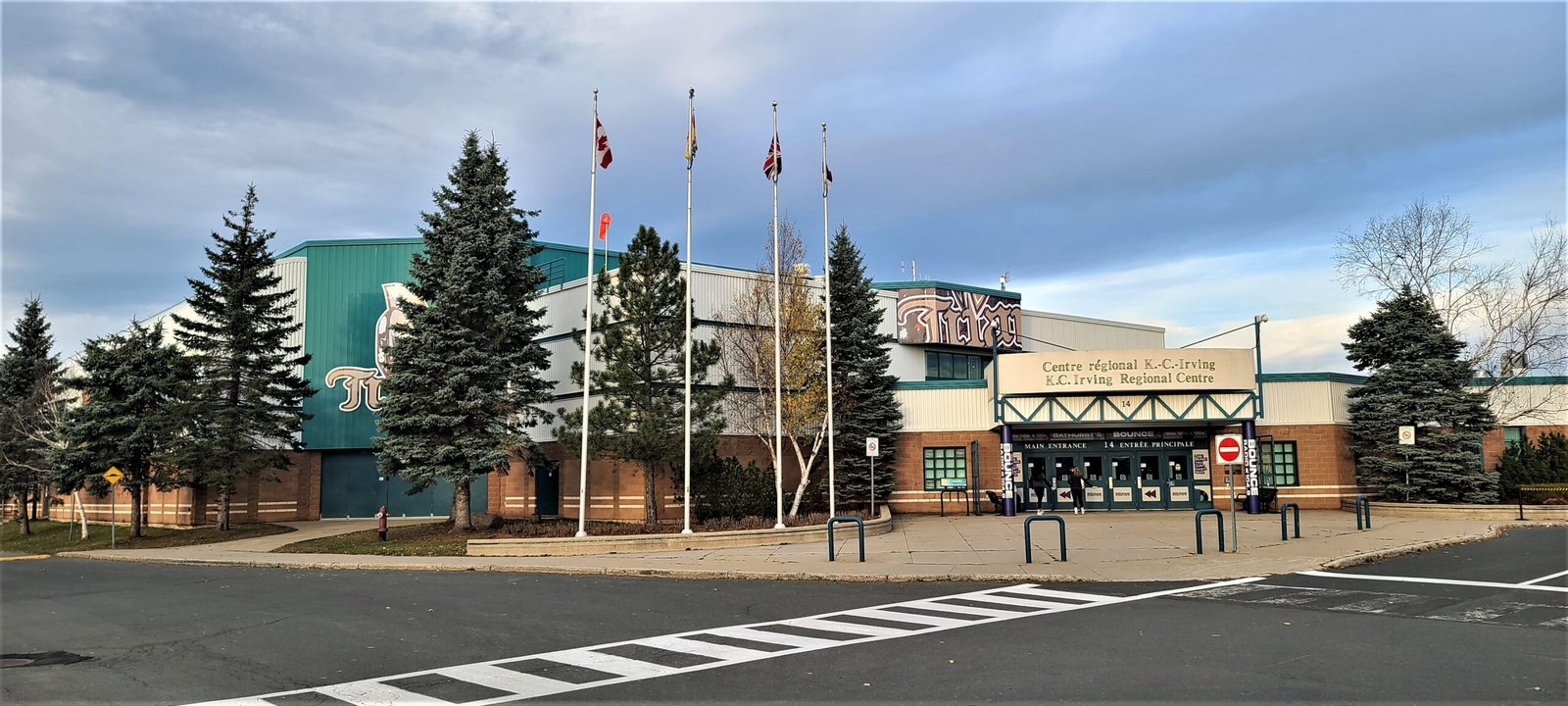 The KC Irving Regional Centre looks like so many other arenas across the country. A small but functional lobby sits in front, with the main rink itself being the larger part of the building behind. It sits on a large piece of land with plenty of free parking near the edge of town. Right across the street sits a small movie theatre, which in front has a fantastic gastropub named Cast & Crew which is done up in movie themes. It was terrific, and seeing as nothing else is within walking distance besides a St-Hubert it’s what I would suggest for your pregame food and drink. Bonus points for the large team logo on the outside of the building, even if it could use some touching up. More bonus points for the banner at the sign near the road (and at the city limits) announcing the team’s 2018 Memorial Cup Championship.