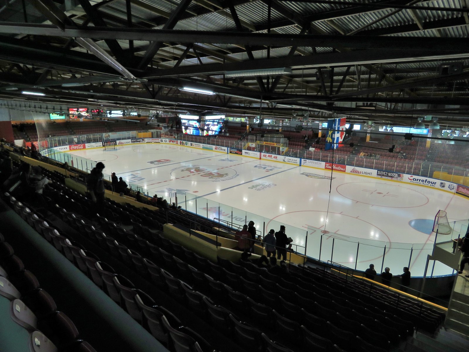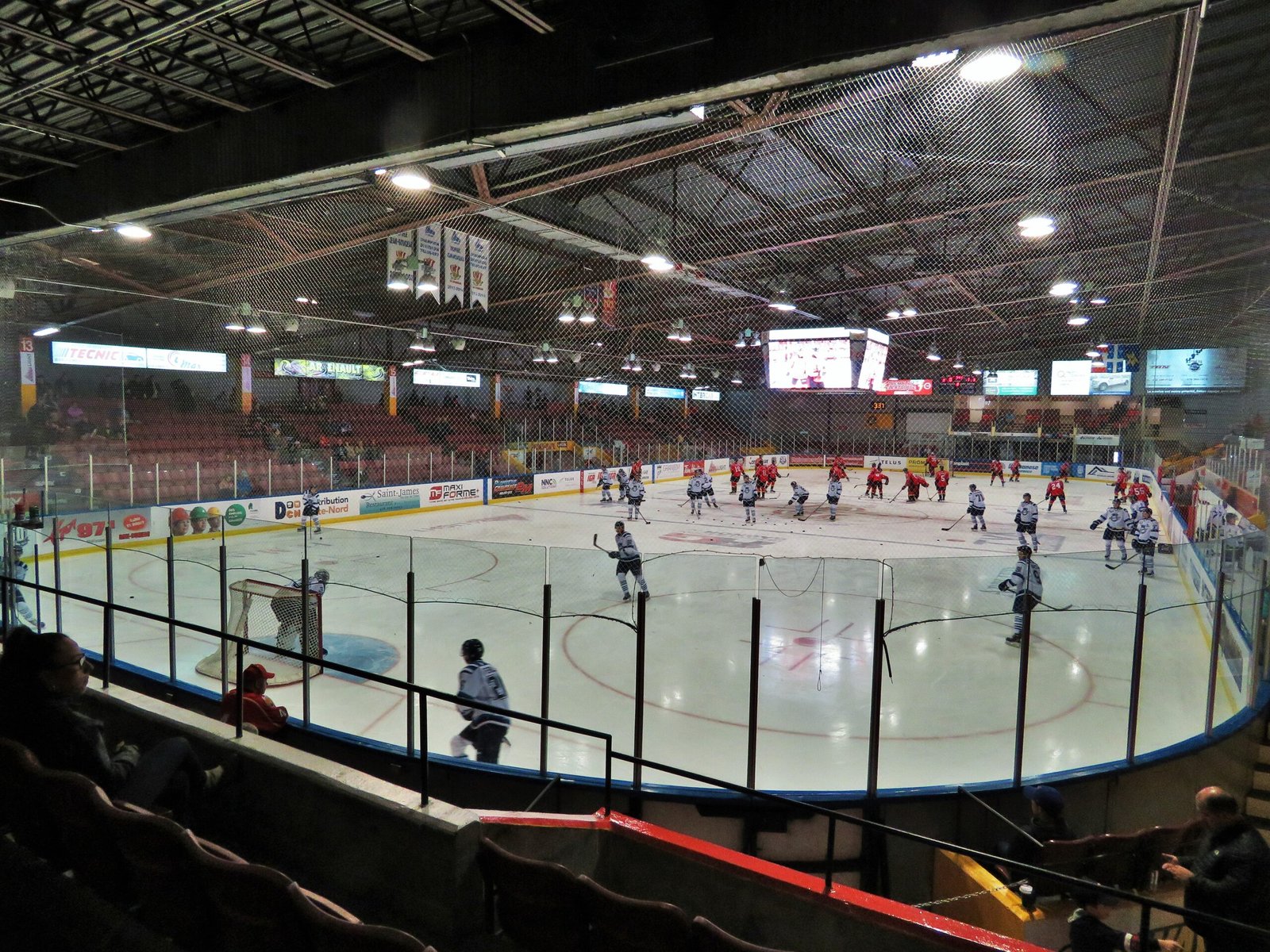 You cannot navigate fully around the ice in Baie-Comeau. There is a concourse that runs under the seats on the big side. One end of the ice has a few rows of seats with a corridor that runs along top of it that brings you across to the smaller side of seats which also has a small corridor along the top of the seats. These sections have no concession areas and are just there to get you to your seats if you’re not sitting on the larger side.