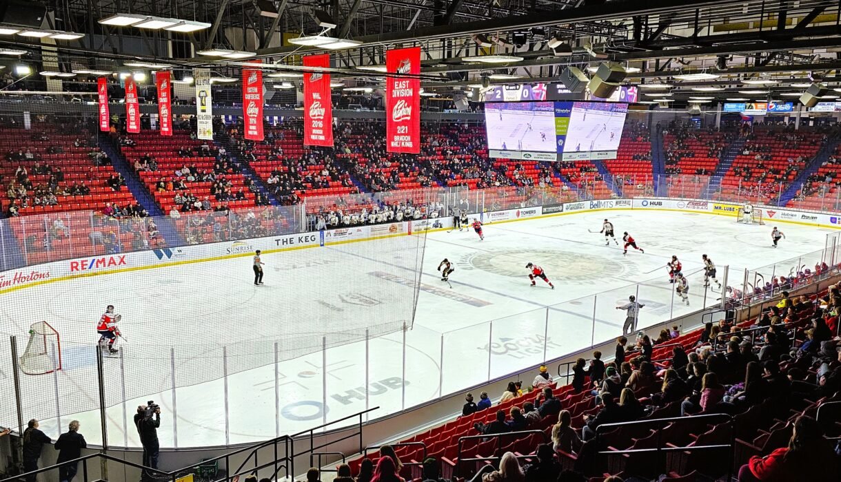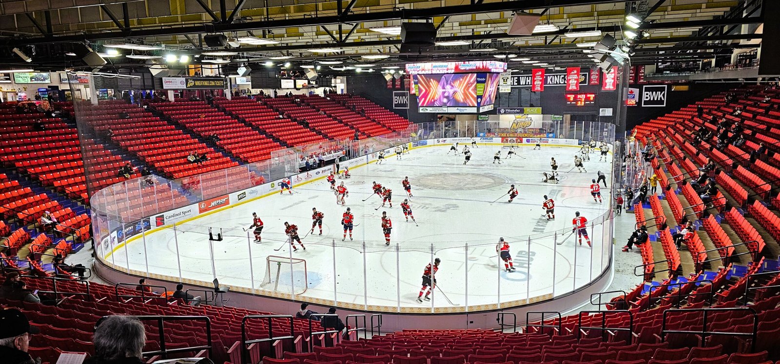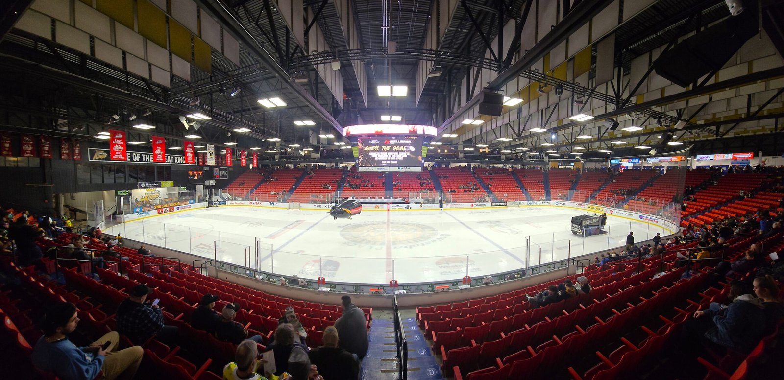 The seats in Brandon are fairly old but still comfortable. The angle of the seating in my opinion is perfect. Not shallow at all, but not overly steep. I usually love a steep setup, and I’ve seen steeper than Brandon, but sitting there and looking around my thought was that it was perfect. There honestly isn’t a bad seat in the house as far as the views of the ice are concerned. Some seats at the very top of the bowl on the sides have obstructed views of the videoboard, with the press boxes hanging down on one side and a row of suites on the other. The benches are on opposite sides of the ice, but unlike some teams who have this setup yet still have cramped benches (Peterborough) the benches in Brandon are very long, taking up almost the entire neutral zone. The music levels are great, not overly loud but not a library either. But overall, as an OHL veteran I couldn’t help but feel like I was in Owen Sound. Not just because of the similar seats but so many things feel like the Bayshore. The concourse, hell even the press box looks exactly the same, built with dark corrugated metal siding. The biggest difference between Brandon and OS for me is Brandon is bigger, with way more rows of seats and laid out in a U shape as opposed to seats all around. The ceiling is obviously higher, but at the same time it still feels very intimate.