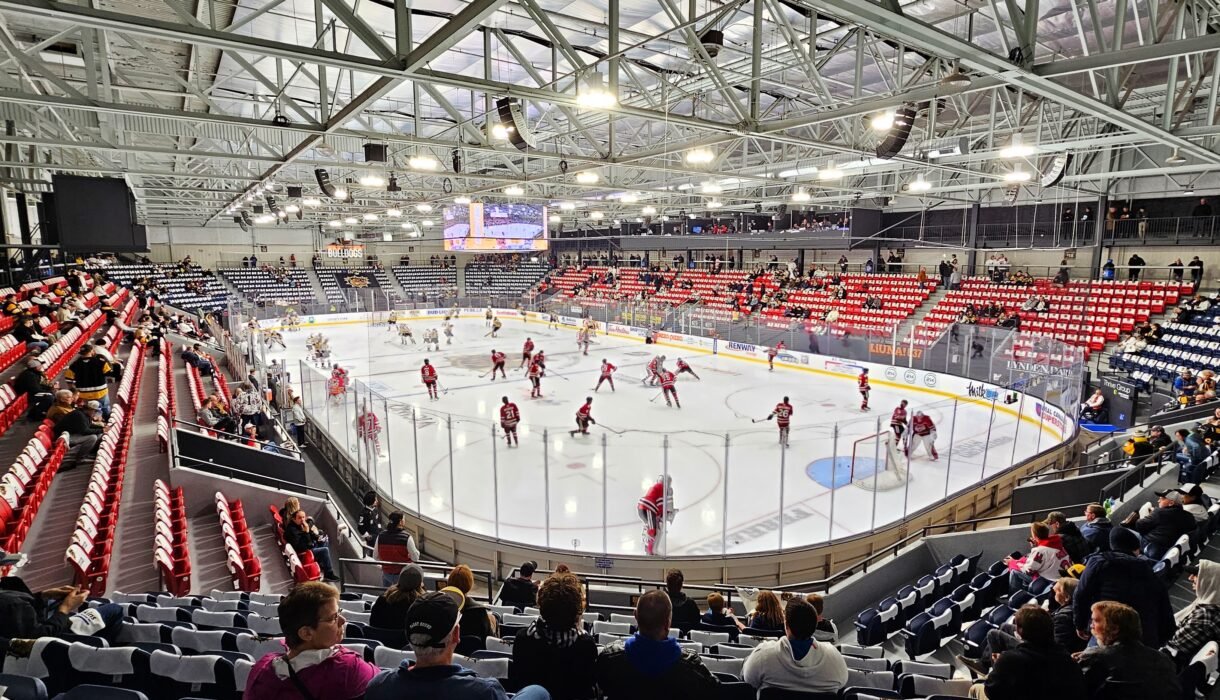 The TD Civic Centre in Brantford sits very close to downtown, and as you drive up to it, it appears to be a small building. That’s because it is. There is a lot of parking on site with the newly repaved lots on the arena grounds itself, but there’s also a large strip mall across the street and a huge parking garage nearby. It’s more than enough to accommodate 3,000 fans. There is a small casino next door, but its lot is not open for game use and security is on site to make sure as much. One thing I love about the exterior is that it’s been redone in Bulldogs black and yellow. Before the Bulldogs moved in, in 2023, it was a very gross-looking flat faded yellow. Now it really stands out.