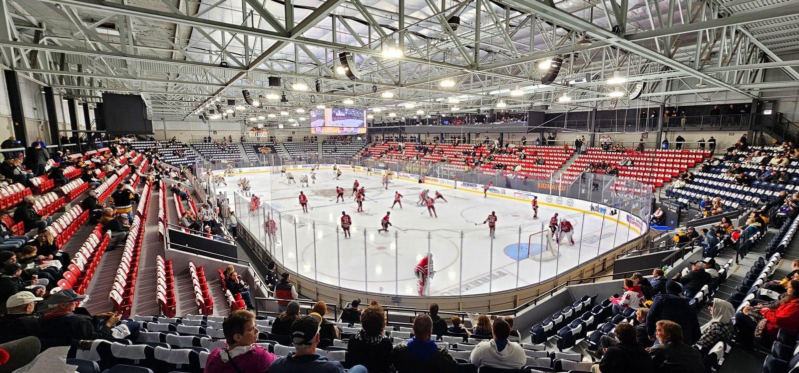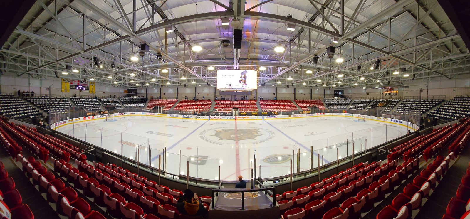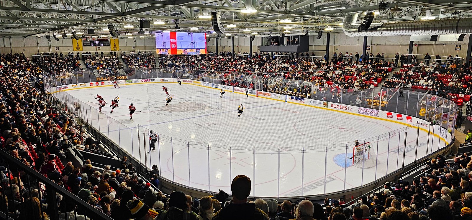 In addition to the new press box, new lighting system, sound system and concession stands, all of the seats are brand new. I found them to be on the smaller side, but I am a large man, and I have also encountered far worse in my travels. Normal sized people would probably find them adequate. With a low roof and exposed metal, and so far nothing but packed houses, the atmosphere in the Civic Centre is pretty good when the crowd gets going. When I attended my first game here, I had complained that the music levels were far too loud. You expect it to be loud, but it was ear-piercing loud and only the loudest of shouting to the person next to you could be heard. Upon my second visit four months later, I was happy to find that the music, while still loud, is now at a much more appropriate volume. It’s the correct amount of loud. I should also point out that the game presentation in Brantford is very good. The video board is used to great effect with good graphics packages, camera work and not over the top on advertising.