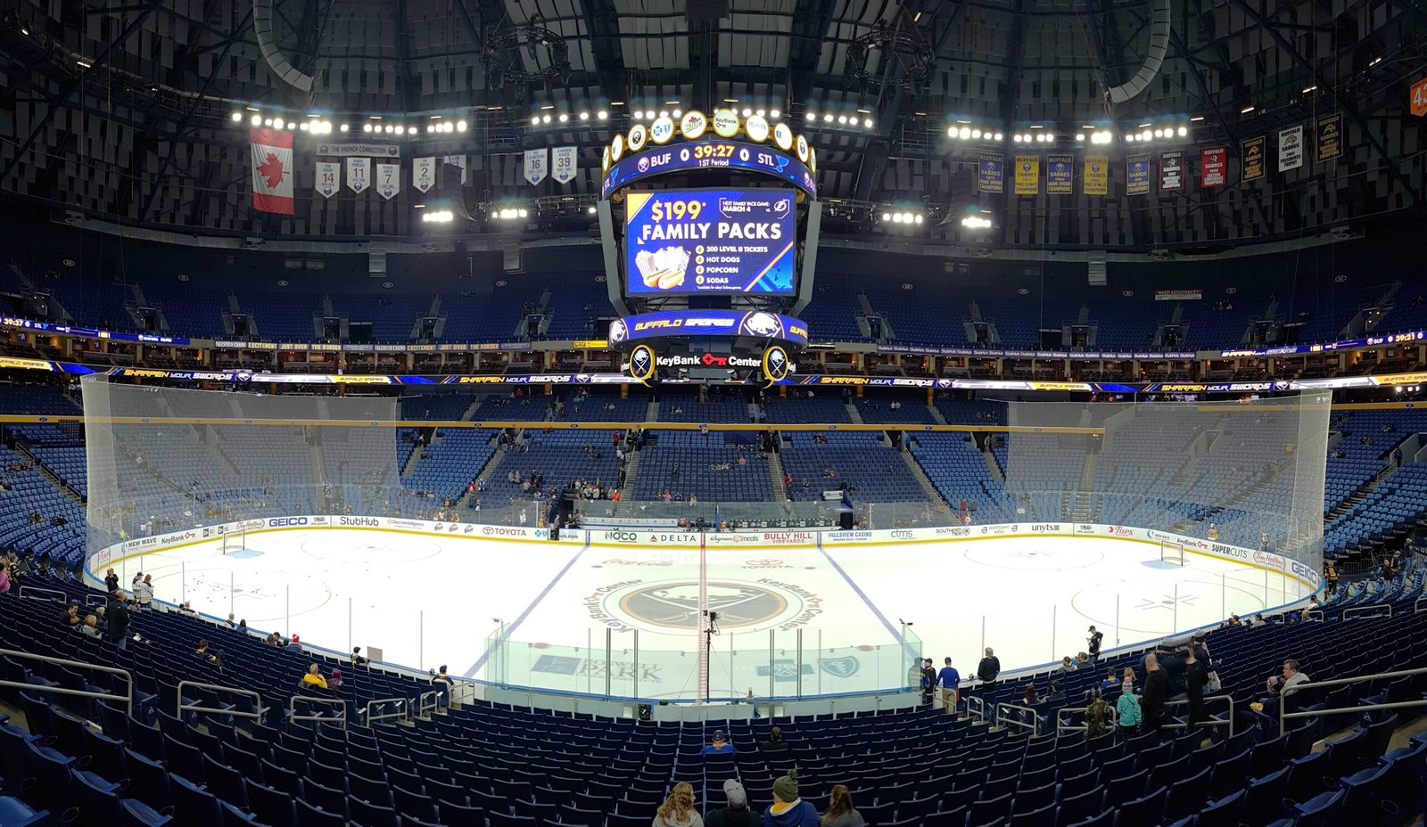 KeyBank Center is like many NHL buildings with two giant bowls of seats that are all comfortable and have great views of the ice. The upper bowl feels particularly steep but is nothing compared to the upper bowl at the old Aud (based on pictures I’ve seen, I wasn’t lucky enough to go). I would say the biggest flaw of KeyBank is how cavernous it feels. Even with a packed house, the roof is so high up and arched that the building feels like an aircraft hangar. Despite that the atmosphere at Sabres games can still be a great one. It is often used as a beacon for fans across the border in Canada to come to NHL games as the tickets are much more affordable than Canadian counterparts in Toronto and Montreal.