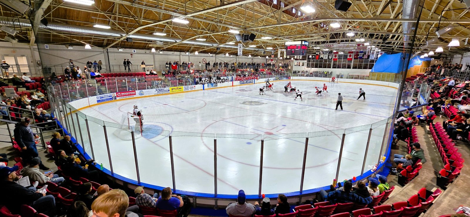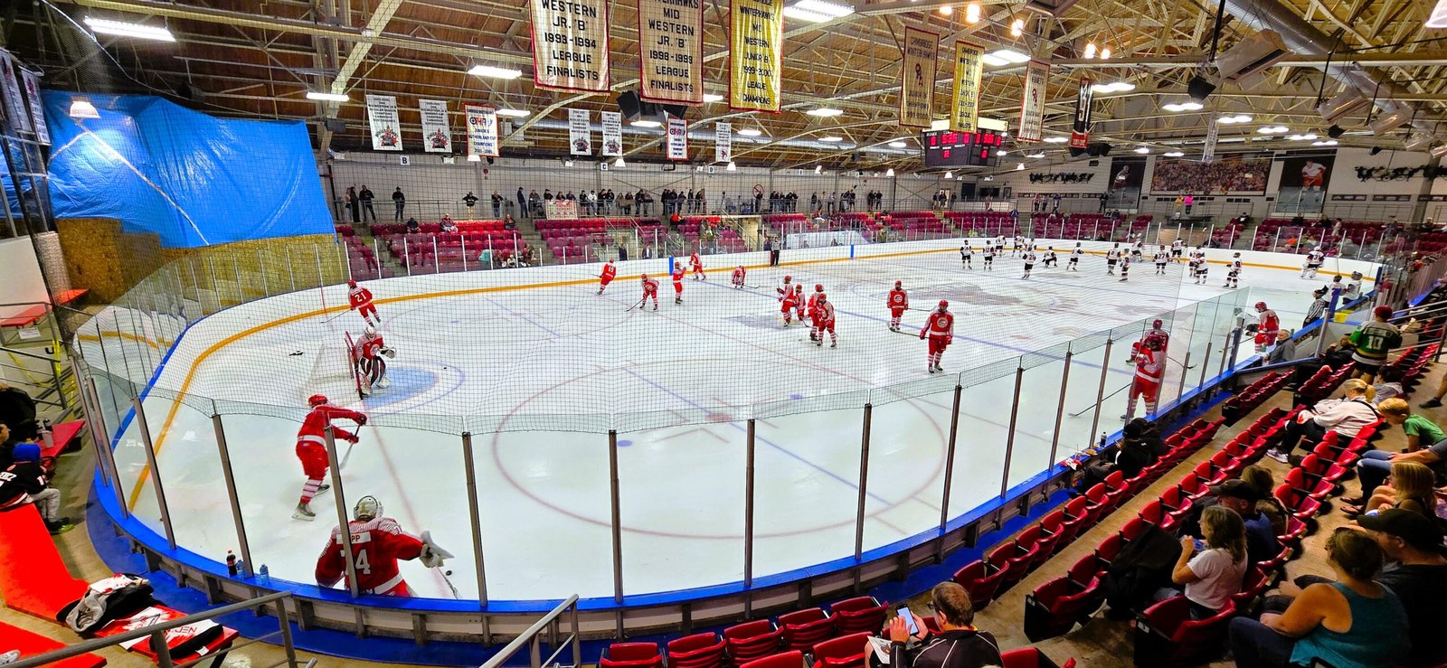 The far end of the concourse has more historic memorabilia in the corners including the original front doors of the arena and the old barrel flood machine from the pre-Zamboni days. Of course, one of the main artifacts from the arena is a large photo of Mr.Hockey himself Gordie Howe in his Detroit Red Wings uniform. Howe before his days with Detroit played hockey in this arena for the Galt Red Wings in 1944-45. Another famous Red Wing Kirk Maltby also has a large photo of himself hanging alongside Gordie’s as Maltby played minor hockey here before his big-league days. The arena used to seat far more people with benches that ran at a much steeper angle right to the back walls of the building. However, a massive renovation took place during the 1997-98 season to modernize the arena and secure its future. In doing so capacity was reduced by nearly half. But without that renovation the arena may not have lasted. During the Redhawks game I attended in 2025 there was one corner of the bowl cut off for a new renovation. I was told it might be for a new elevator. Despite the fact that the rink is now into its second century these upgrades have secured its future and the rink shows no signs of closing anytime soon.