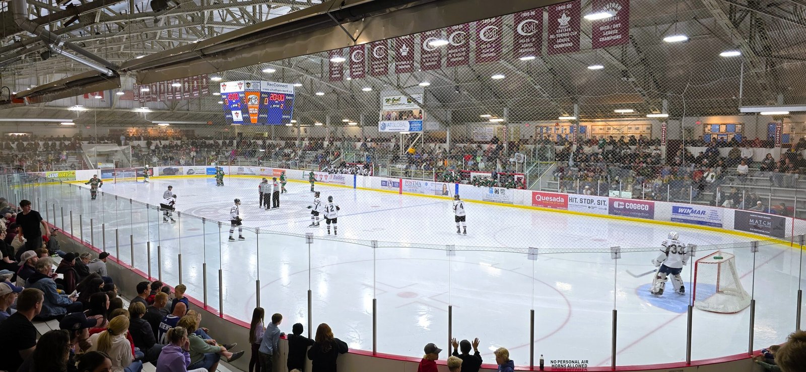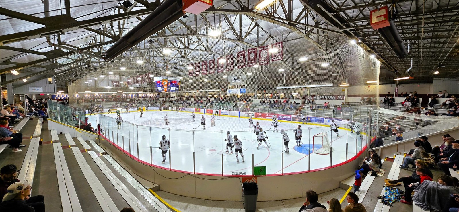 The arena is full of history, with tons of banners in the rafters celebrating the long history of the Maroons franchise, which dates back to 1959, as well as other teams that have called the arena home over the decades. The walls of the concourse are also lined with fantastic old photographs and artifacts of years gone by. Plus, there’s a simple but effective touch of some maroon paint on the walls. There is also a small team souvenir kiosk in one of the far corners of the concourse. Admittedly, the night we went was pretty high stakes, as Chatham was in the midst of a conference final playoff series. With such high stakes the crowd and atmosphere were incredible as soon as the teams hit the ice and the game got underway. Unfortunately for us and the Chatham faithful, the Maroons stunk the joint out that night, and the atmosphere slowly died out as the game went on. But fear not, Chatham would not only go on to win the series but also capture the Sutherland Cup for 2025.