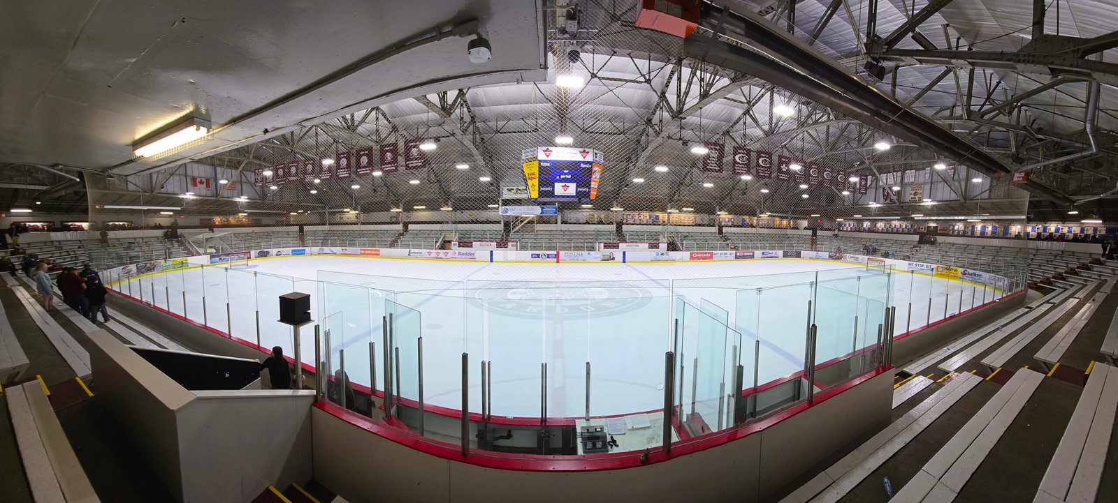 There are seven rows of wooden benches that surround the ice surface, and it is all general admission seating. There is also just enough room for standing behind the back row of benches on the walkway around the bowl. There are support columns at the top of the bowl, but these will only obstruct your view if you have a standing room spot. There are also press boxes hanging over the seating areas at centre ice on either side of the building, and a newer serviceable scoreboard hanging over centre. Also, due to the small size of the rink there is white netting surrounding the entire playing surface.