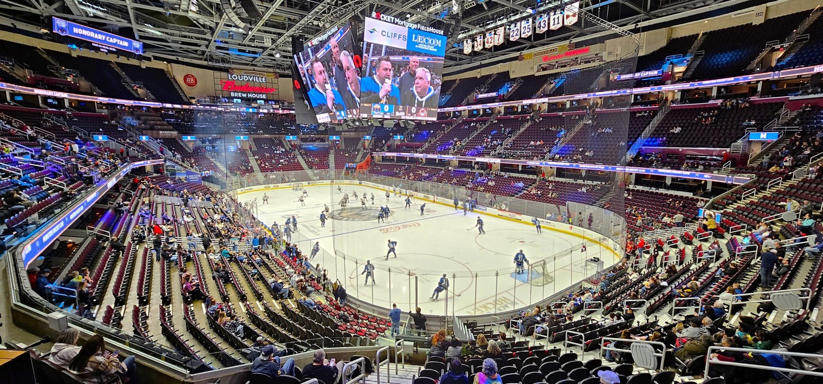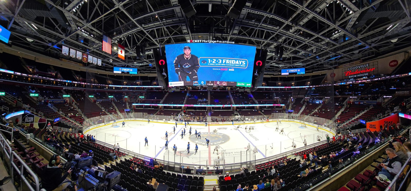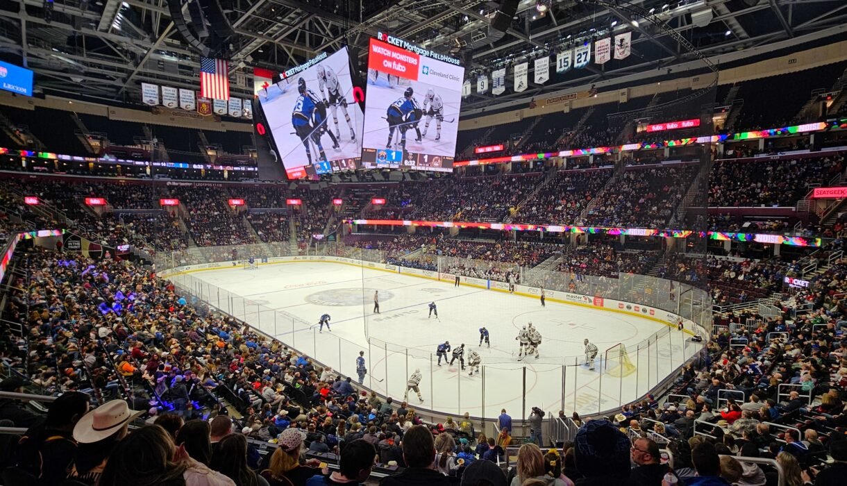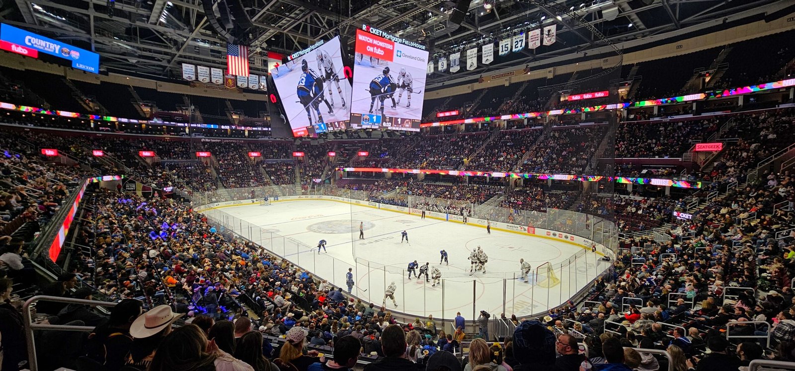 Rocket Arena has a two-tiered lower bowl along the sides that reminds me a lot of the lower bowl setup at the Saddledome in Calgary. However, in the ends behind the net the bowl is continuous. The lower bowl is much steeper than most lower bowls in similar-sized buildings, other than the lowest seats on the sides. While I never got up to the upper bowl, it felt like the lower bowl was much larger and the top of it goes higher up the building than many similar sized rinks. One can’t gloss over the absolutely gigantic video scoreboard, which is an odd shape. Despite how huge it is, it honestly didn’t feel out of place for me. Game presentation is done very professionally in Cleveland, which isn’t surprising as the main tenant is obviously the NBA’s Cleveland Cavaliers, and I would imagine the teams share some technical staff.