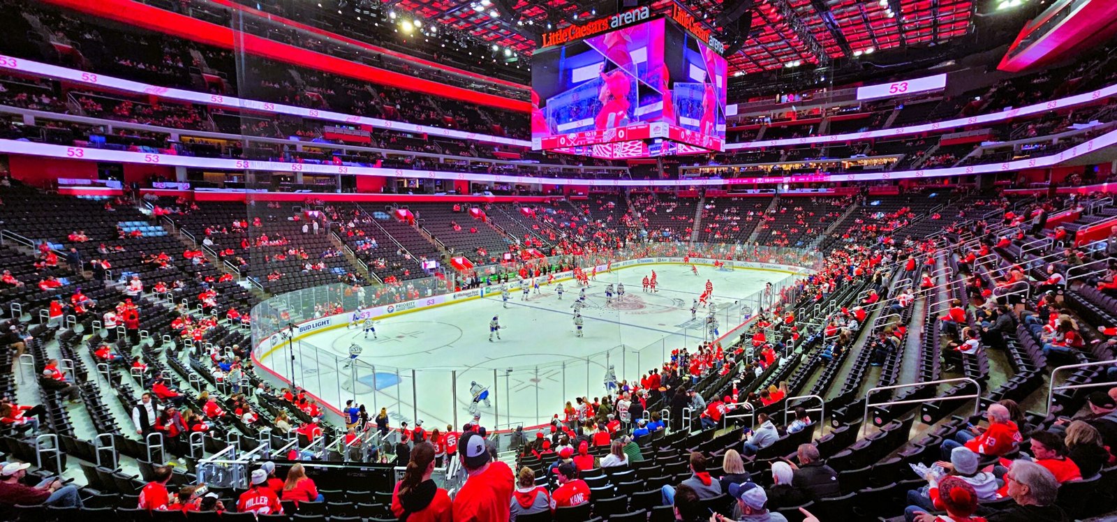 Little Caesars Arena is located in midtown Detroit in what has become a very nice entertainment district. The rink sits just on the north side of I-75 across the interstate from Ford Field, Comerica Park, Fox Theater and a wide range of bars and restaurants. Many people’s first reaction when they think of Detroit is a poor, run-down and dangerous city. While Detroit has had its problems, no doubt things feel like they’re on an upswing right now and the area where the rink sits in is very nice. The actual rink itself is somewhat hidden before an exterior mix of red and yellow brick and lots of windows. It’s almost a structure within a structure. The 100-level concourse is at street level, and once entering the building you feel like you’re still outside with lots of windows allowing natural light in and a skylight like roof over the concourse. It’s like being on a street surrounded by restaurants and patios and is an amazing vibe. Its super wide and easy to navigate.