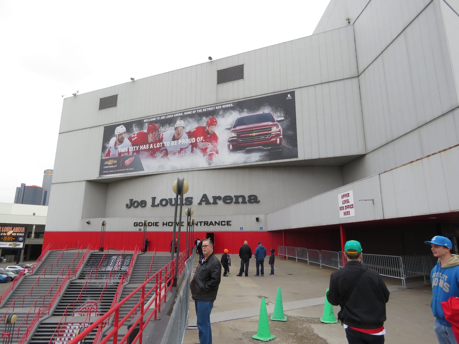 The Detroit Red Wings began life in 1926 as the Detroit Cougars and believe it or not their first season they actually played at the then brand new Windsor Arena (then named Border Cities Arena) until the Olympia was ready for them a year later. The Olympia closed its doors in December 1979 and the Red Wings moved into the brand new Joe Louis Arena. They made this arena move long before the other original six teams started construction on new rinks in the 1990s and in the long run the Wings kind of suffered for that. Joe Louis Arena used to sit on the shores of the Detroit River and was a part of the Detroit skyline for decades, sitting next to the newer Cobo Hall and convention center. While it had a facade that loudly announced its presence, it was a very bare bones exterior of grey and red siding with no windows whatsoever. The most recognizable part of the exterior was likely the giant stairs that would take you from street level up to the entrance doors at the concourse level.