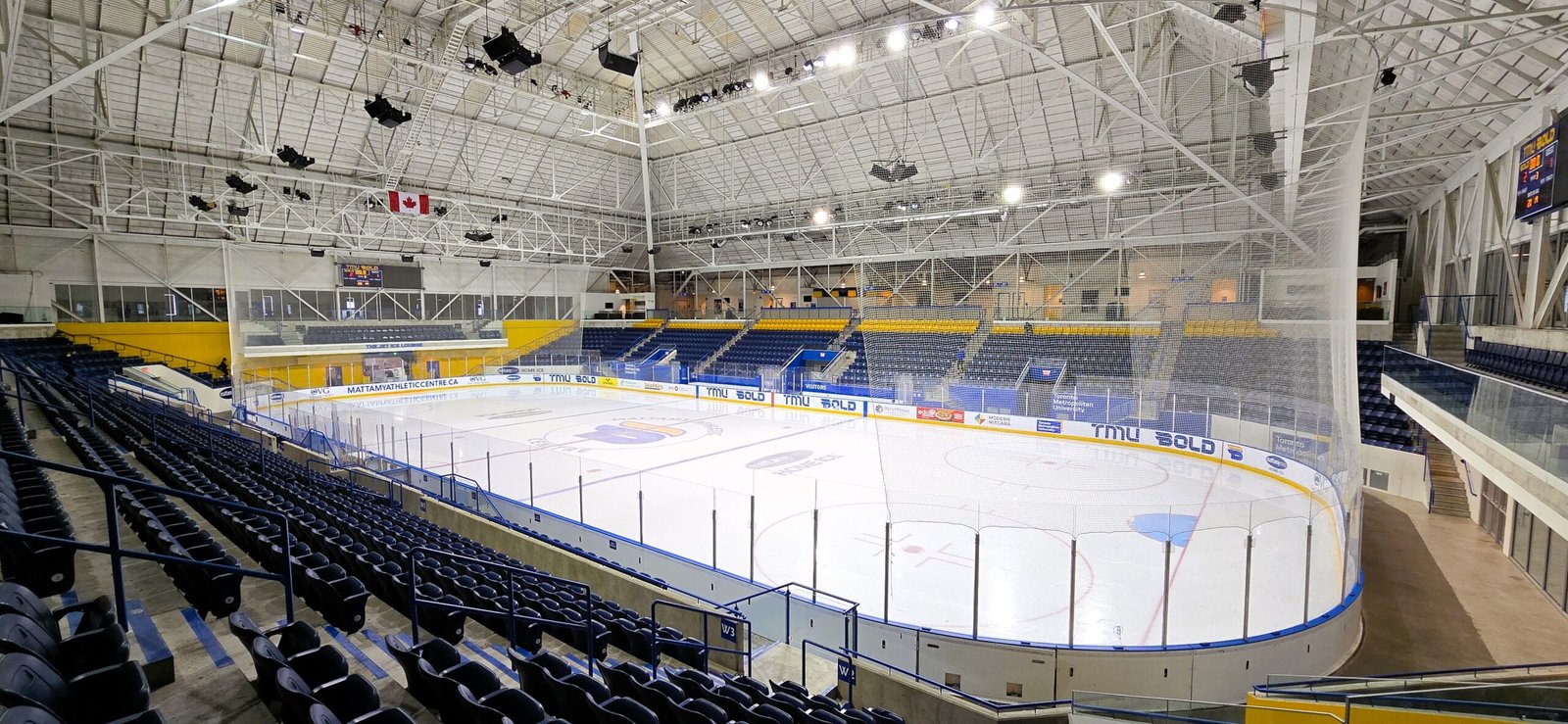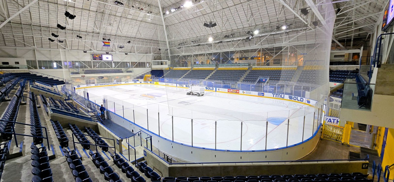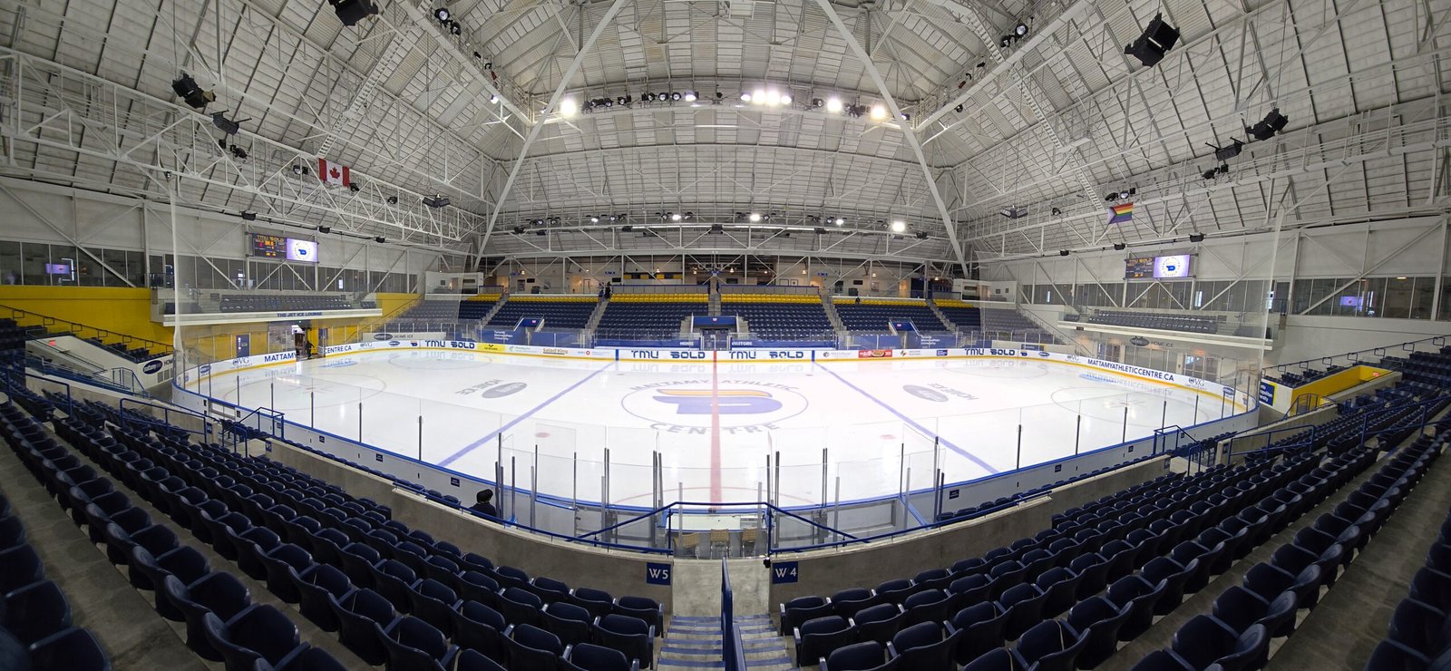 For the next decade the Gardens sat locked up, empty and dark with the odd photo video clip leaking out. But in the early 2010s the renovations finally took place with a new Loblaws grocery store going in at ground level and the top two floors given to Toronto Metropolitan University for a space now known as the Mattamy Athletic Centre. While TMU signage now exists on the outside they have thankfully restored the original Maple Leaf Gardens signage above the main entrance on Carlton St. A new arena now sits inside Maple Leaf Gardens but the ice surface is now three floors up about at the level that the highest seats in the old Gardens sat. The new arena seats about 2,500 people and is designed as a 1/8 size Maple Leaf Gardens with most seating down the sides, limited corner seats and two small balconies with two rows of seats hanging over the nets. There is no centre ice scoreboard but two with small videoboards that hang on the walls in each end of the rink.