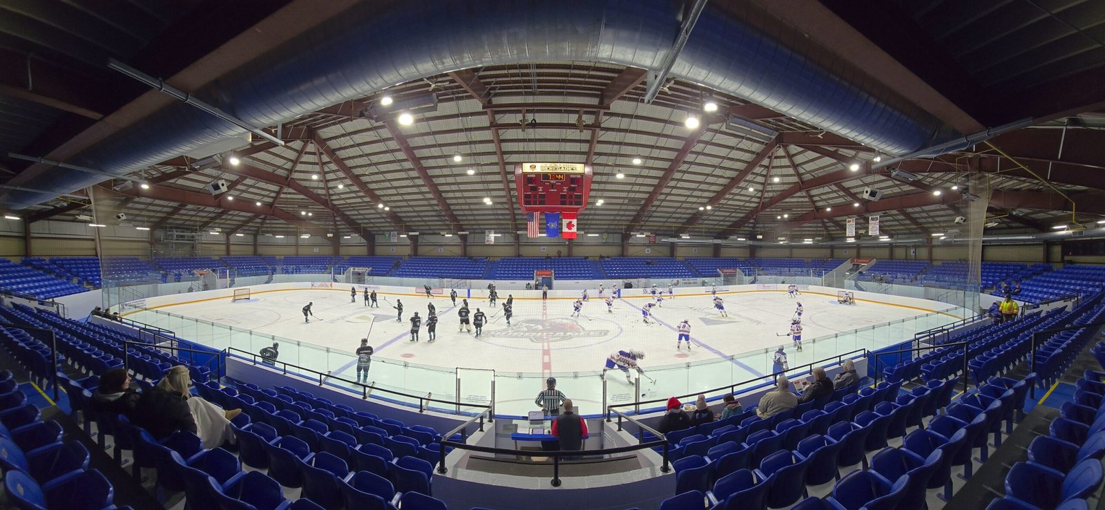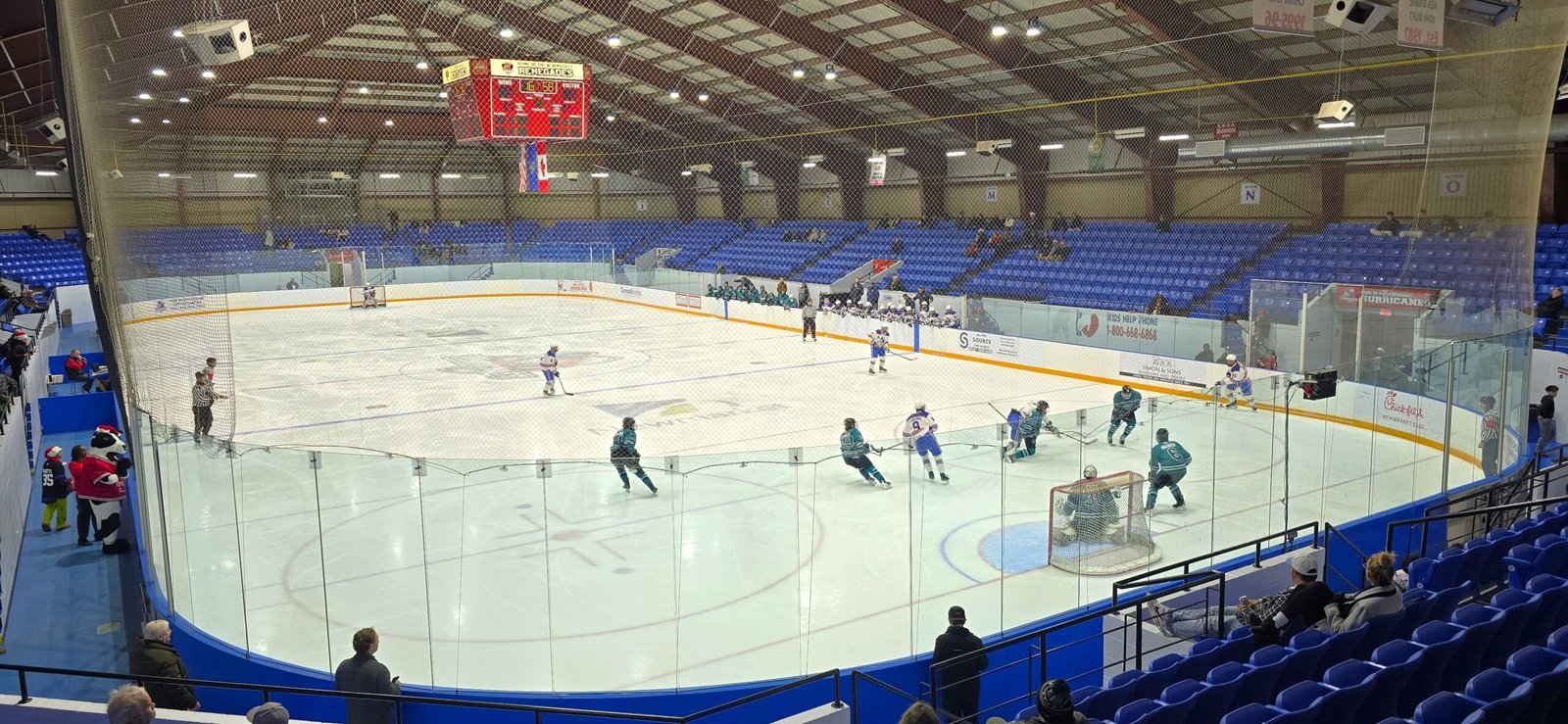 Upon entering the building’s main entrance, you spill into a large lobby with ticket booths, trophy cases and a couple corridors leading to the rest of the complex areas including a swimming pool. A set of doors leads you to a small, somewhat narrow concourse that is at ice level under the seating bowl. This concourse can be used to go around the entire rink. There is an impressive collection of framed photos of all the Jr A Hurricanes alumni from over the years that have moved on to higher levels of hockey. There is one snack bar at one end of the rink while the opposite end has a lounge/hall area. All the dressing rooms and bathrooms are accessed at this level, and there is also another entrance to the building on the back side. Eventually you find one of the openings to the seating bowl and find yourself in a standing room/moat area between the seats and the glass. Like many other buildings such as Brantford, Peterborough and Rimouski, the first row of seats is elevated above this moat area and you climb up stairs to either reach your seats or to an additional pathway around the top of the bowl. In some areas this top of bowl concourse is wide enough that you could easily fit another row or two of seats or add standing room. This alone could easily raise the capacity to north of 4,000. The rink’s roof arches high over the ice. The bowl of blue plastic seats is fairly new and comfortable enough. The seating bowl is slightly shallower than in most places, but it’s not nearly as bad as Plymouth or Chicago. Some of the views in the corners are not ideal, but at worst aren’t horrible either.