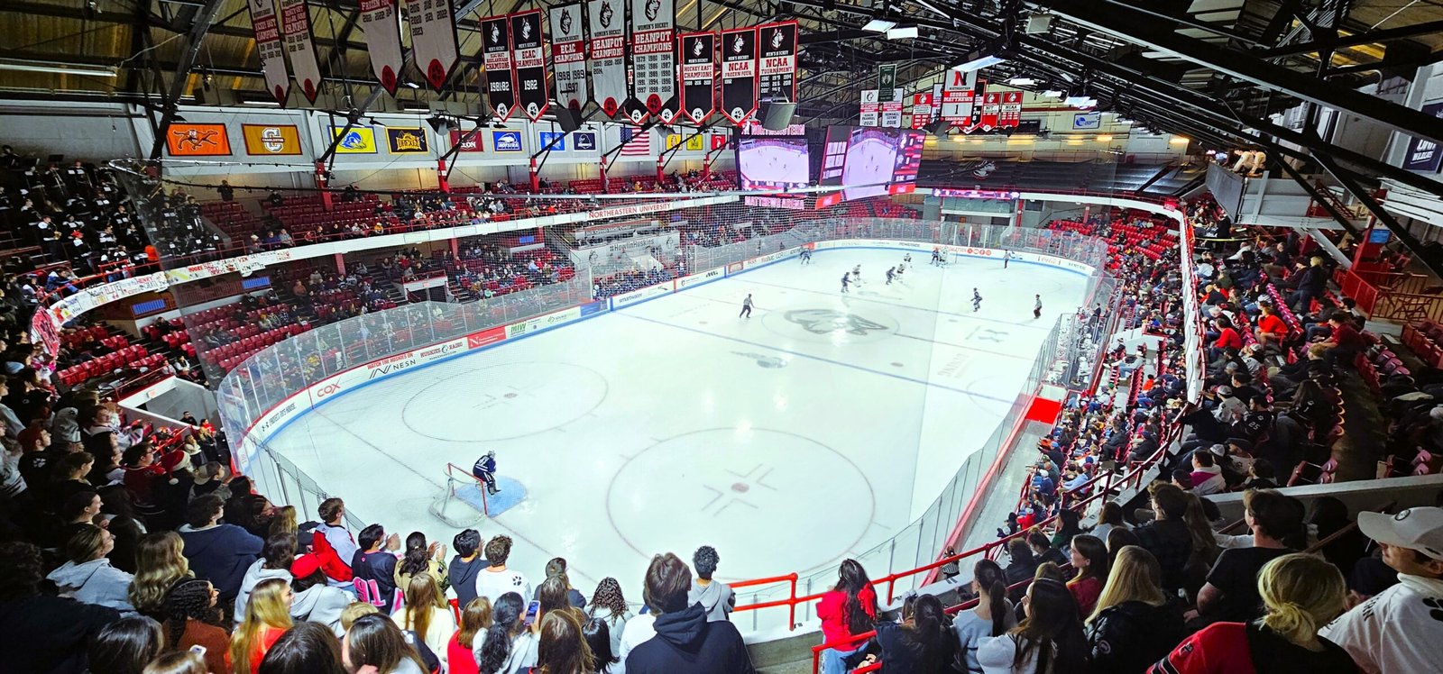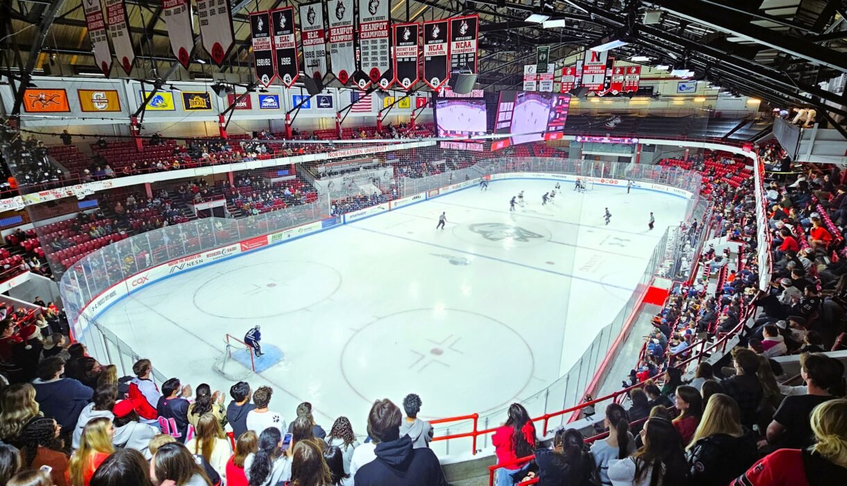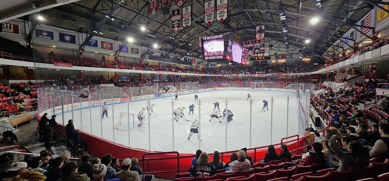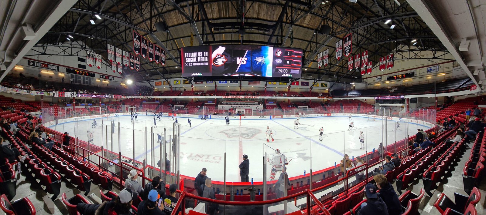 The thing that has always appealed to me the most about NCAA hockey is the atmosphere. My first NCAA game was at Yost Arena in Michigan, and it was incredible, with a giant student section with soccer-like songs and chants that were definitely not PG rated, a band and tons of fans supporting the team. At Northeastern the student section is the non-condemned end of the upper bowl. They give it a good effort, but were nowhere on the level of Michigan. The rest of the building on the night we were there was also half full at best, so the atmosphere was a tad disappointing. Now comparing a much smaller school like Northeastern to one of the largest programs in the country (Michigan) probably isn’t fair, but it taught me to temper expectations when going to smaller NCAA schools in the future. The walls of the upper bowl are dotted with the team flags throughout the same conference as Northeastern and the rafters are filled with banners showing off the Huskies success over the decades of both the men’s and women’s teams, as well as a banner commemorating the arena as the original home of the NHL’s Boston Bruins. One of the only signs of new tech in the building is the scoreboard hanging over centre ice, which is crisp HD quality and set up more longways with super wide screens for the sides and smaller screens for the ends much like in Kalamazoo. All of this is under a beautiful arched wooden roof.