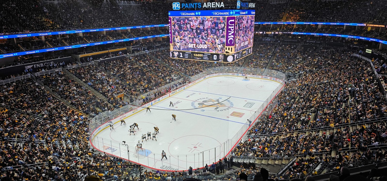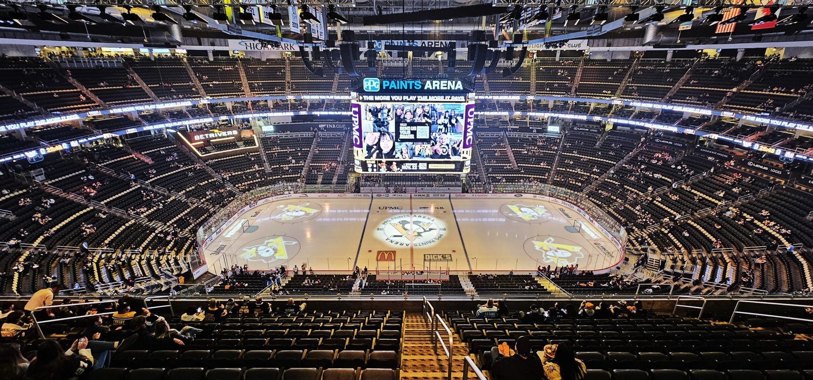 PPG Paints Arena is one of the more cavernous buildings I’ve been to in the NHL. But despite this the atmosphere there is very good. The A/V production is as top notch, as you would expect for the pro product that is before you. There are all the new luxuries anyone could want, with a vast variety of concession options and merch stands dotted throughout the rink. The sight lines are good with an extremely steep upper bowl. The upper bowl concourse is actually at the top of the bowl, so if you have a seat in row one you have to walk all the way down. Those afraid of heights might want to avoid this, as it’s a steep decline down to the first few rows.