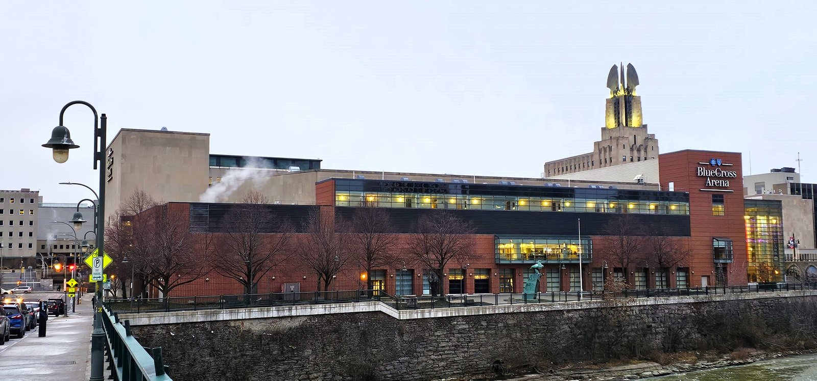 The Blue Cross Arena at the War Memorial (as it’s formally known) was built in the mid 1950s and got a major renovation in 1998. What stands today is an older building with all the modern amenities that most fans could ask for. The arena sits in the heart of downtown Rochester on the banks of the Genesee River. There is a large parking lot on the south side of the arena that should suffice, as well as lots of street parking around. The main entrance is on the opposite side of the building from where this photo was taken. It is a large glassed in entrance at street level where the main team store is fully stocked with tons of gear. Once past the store you go up a large staircase to the main concourse level, which actually dips a tad lower in that end of the building. The building has also been home to the NLL’s Rochester Knighthawks since 1995.