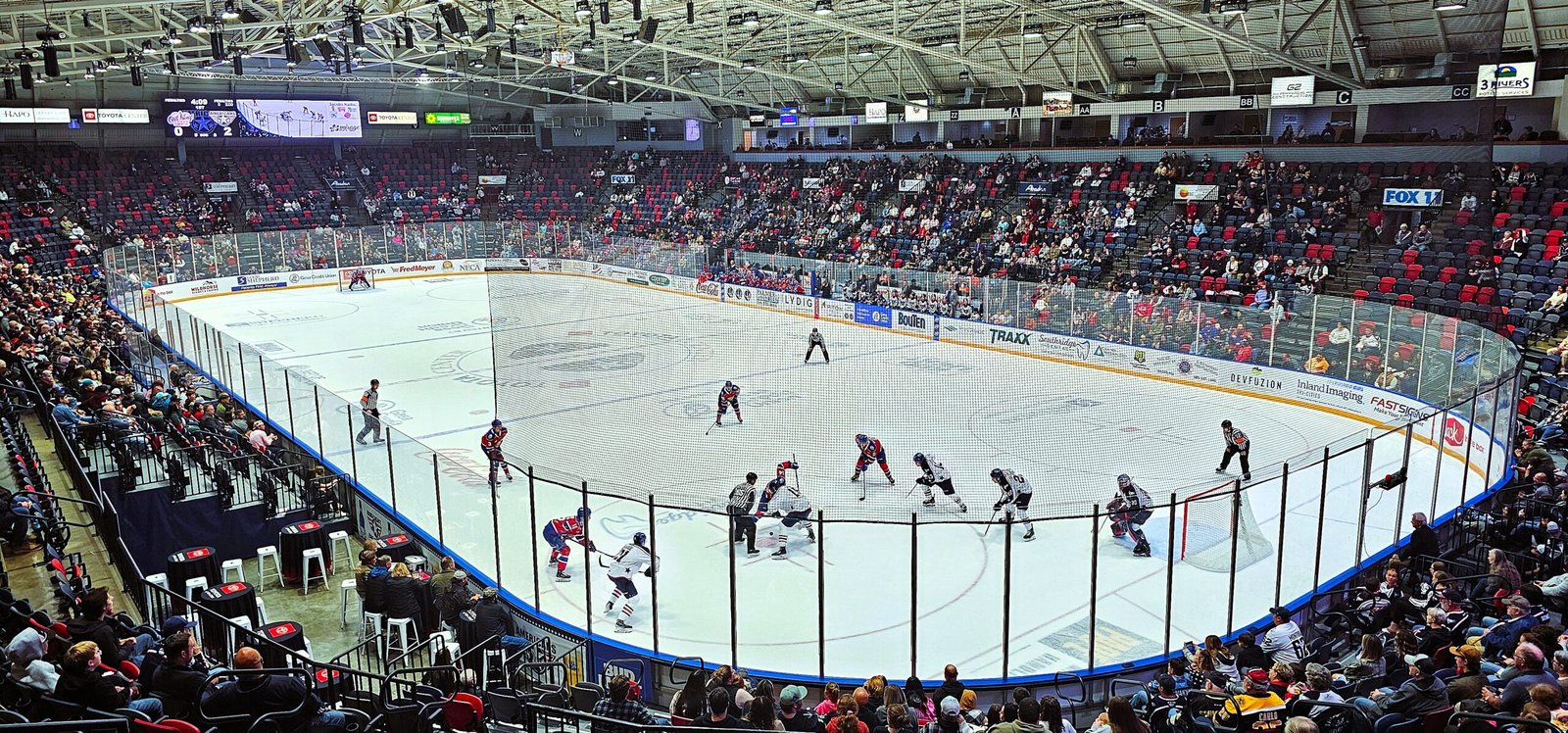 All the the new seats are done up in team colours, which looks nice, and there are a lot of team colours and history on display in the concourse. The concourse is a tad cramped and dark. On the main entrance side there is low drop-down ceiling due to the suites above, which gives it a bit of a claustrophobic feel. The team store is also very small even by CHL standards, but is packed with a solid amount of Ams gear. The opposite side of the rink however, the concourse has windows to the outside and no overhang, so it feels a bit brighter and more open over there despite it still being a tad cramped.