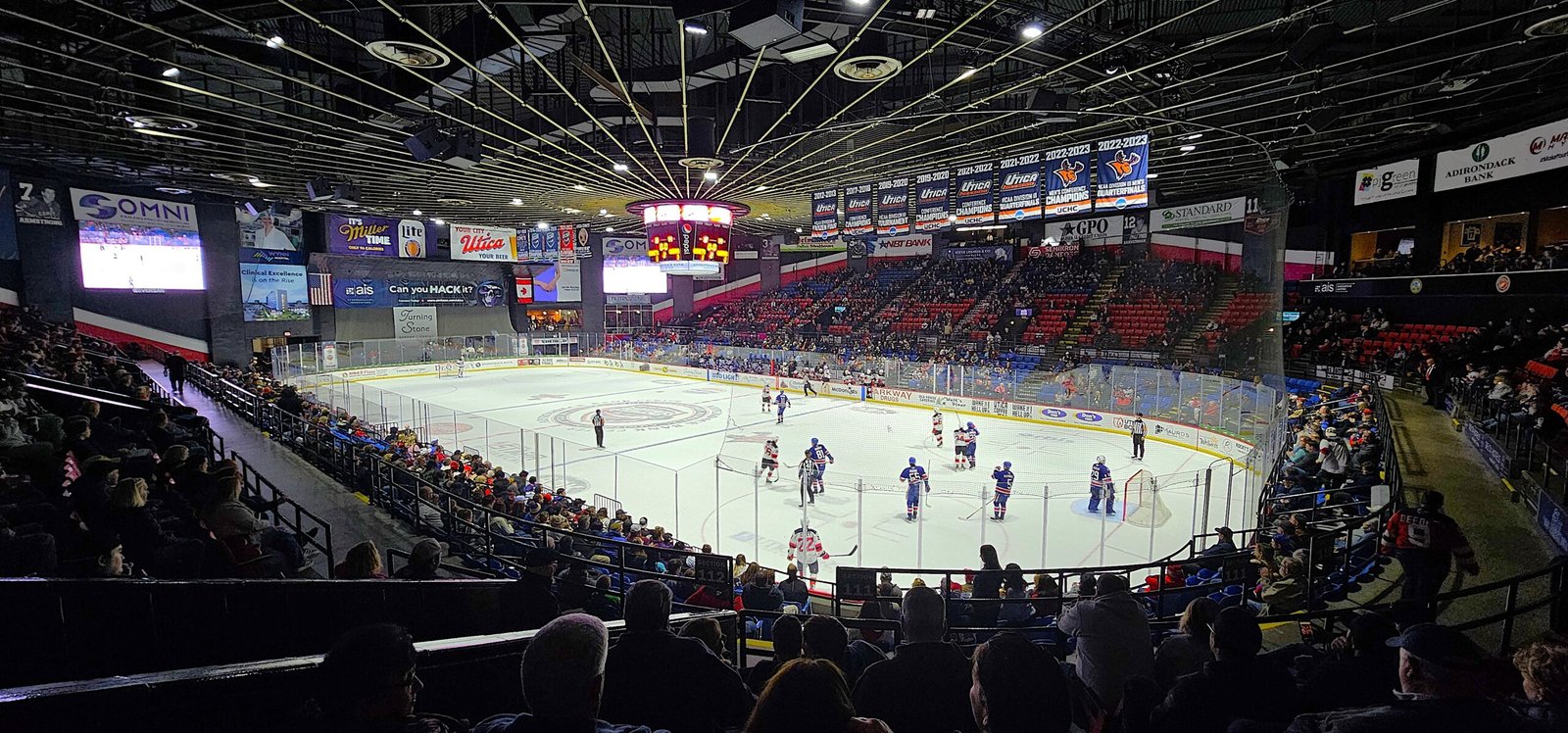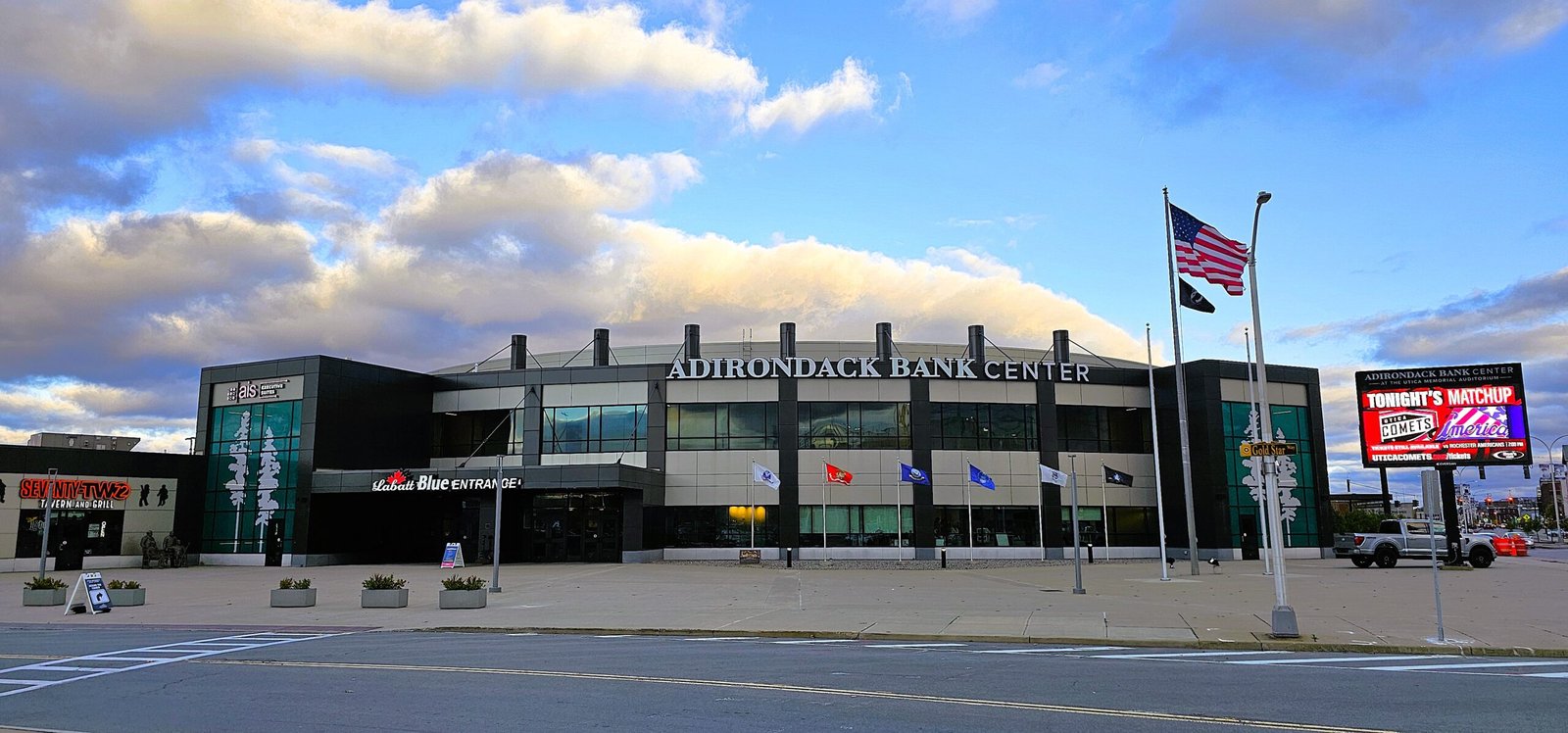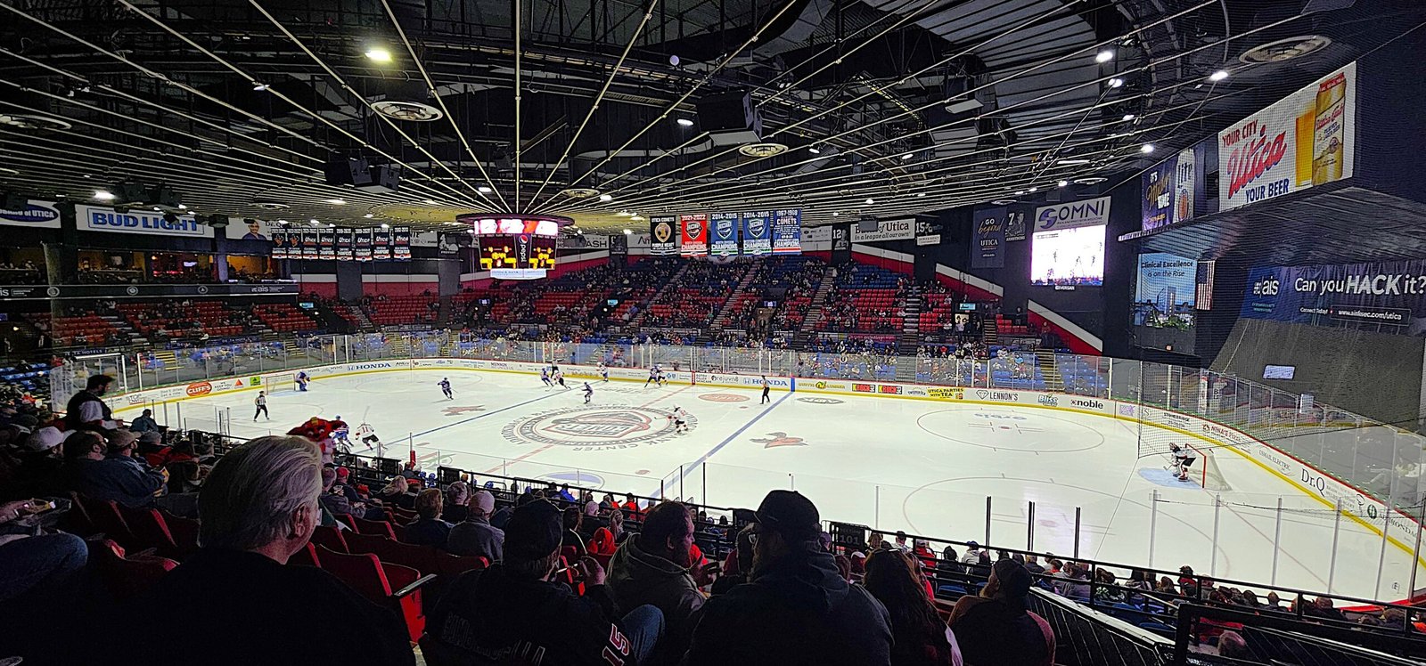 The Utica Memorial Auditorium (now called Adirondack Bank Center) that the locals lovingly refer to as The Aud (Buffalo and Kitchener would like a word) is located on the edge of downtown Utica, just across the street from the city’s main hospital. Despite the rink being past its 60th birthday, the exterior has seen renovations that makes it look like a much newer facility with an added-on restaurant that is a decent enough modern sports bar. There’s also plenty of free parking on a street behind the rink, which was a welcome sight to see.