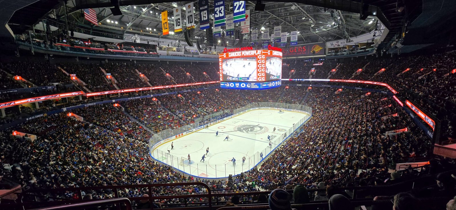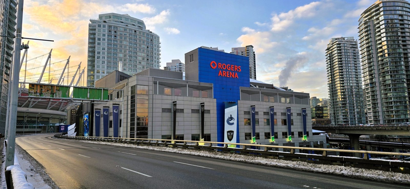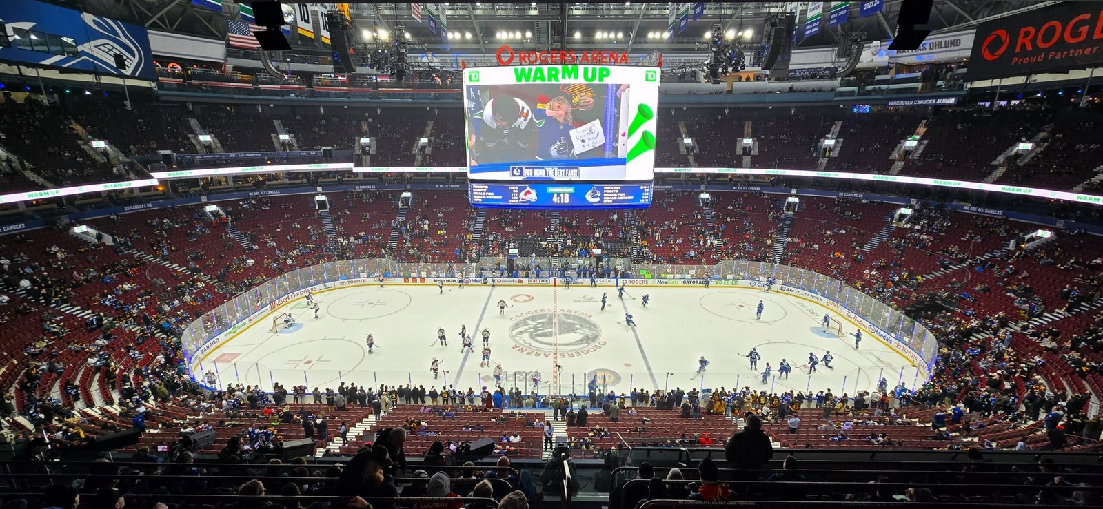 Rogers Arena sits in the heart of downtown Vancouver, nestled between a pair of elevated expressways and a stone’s throw from the much larger BC Place stadium next door. Surrounded by condos, it really feels like you’re in Toronto… but way nicer. Unlike Toronto, or many other rinks for that matter, there are entrances to the rink at the 300 level, with more entrances further down at the 100 level. There isn’t a ton of room on any side of the rink’s exterior, however, for socializing or watch parties like you see at some rinks. While there are many bars and restaurants close by, they are all a couple blocks away. Though there is a Costco mere steps from the rink, so if you like $1.50 hot dogs there’s no need to walk far!