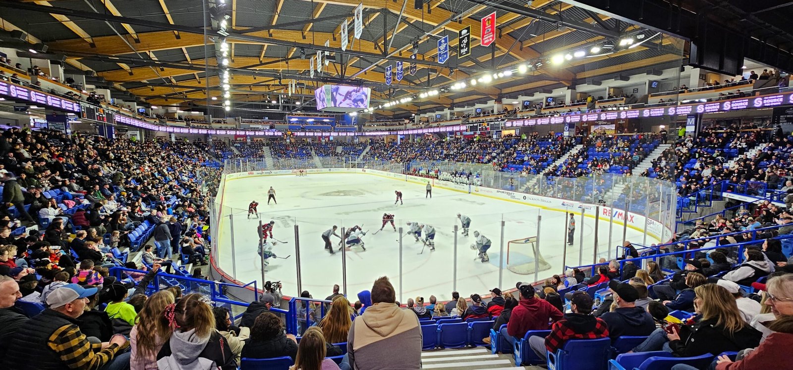 Entering the Events Centre at street level you immediately go up a large staircase to the main concourse in one of the corners of the building. What lays in front of you is a pretty typical clone rink. It’s your usual 5,000ish seat bowl with a concourse that runs around the top with a full view of the action while you’re in line at the concession stand or bathroom. The concourse isn’t the widest around, so with a packed house it can be a little slow to navigate, but some spots open up to help ease foot traffic flow. All the seats in Langley are blue plastic (no club seats from what I saw) that are comfortable enough with good views of the ice.