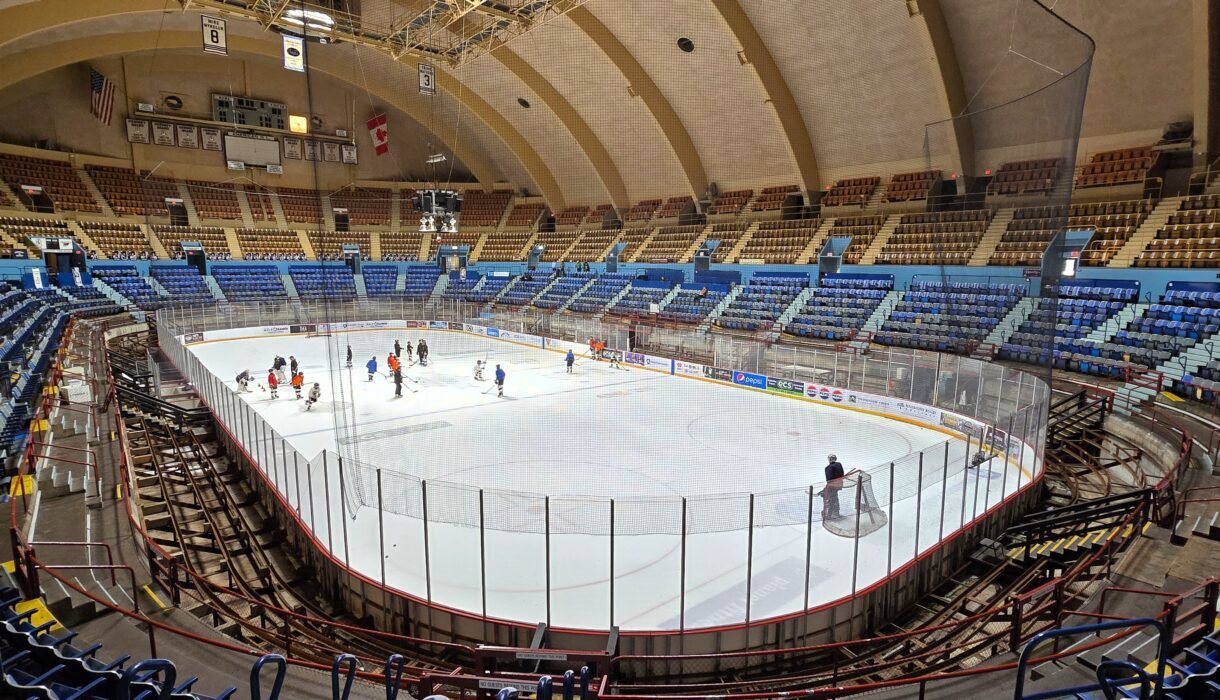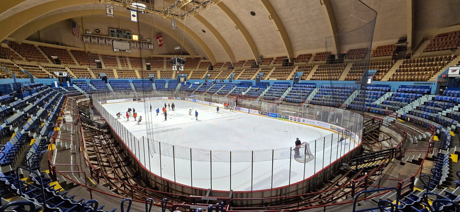 Kevin Jordan and I stopped in to check out the historic arena before a Hershey Bears game in January 2025. There was a public skate advertised that day so we brought our skates, eager to step on the ice in such a cool historic old barn. Unfortunately for us a huge snowstorm hit the area, and while the Bears game was still on later that afternoon, the public skate was canceled and the rink sat dimly lit and empty. However, with nothing now to do for almost 3 hours and the roads in a dangerous state, we decided to just hang out in the quiet and slightly dark arena with permission from security. We did return the next day before departing the area for photos with the lights fully up that you see below. It was quite a cool experience to sit in a dark empty rink and just soak it all in for an extended period of time.
