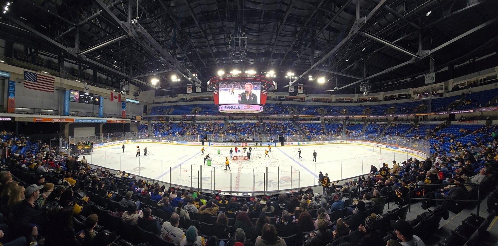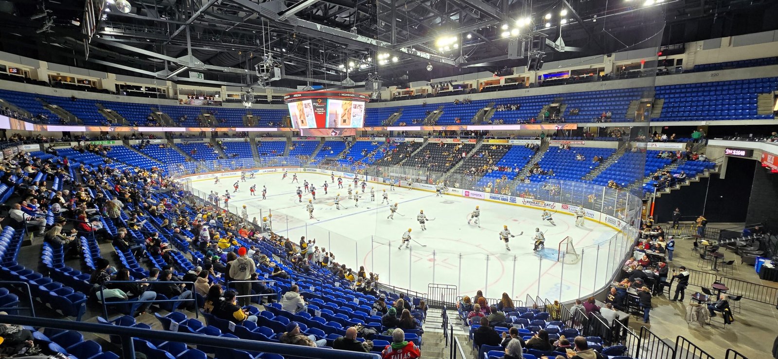 Side note: I forgot to take my usual panoram shot of the rink during warmups and had to do it at intermission before the lights went down, but this was as close as I could get to centre ice as most seats remained occupied for the chuck a puck. It annoys me that this wasn’t dead on centre ice, and post-game the lights went down so I couldn’t try again. Luckily it’s bright and clear at least.