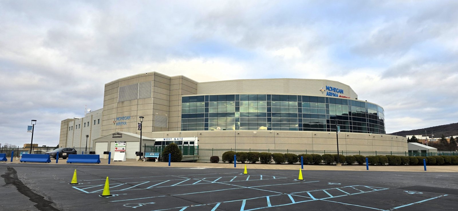 Mohegan Arena sits just off of I-81 in Wilkes-Barre, Pennsylvania in the middle of big box hell like so many arenas of the 90s tended to be. It’s also surrounded by a massive (and thankfully free) parking lot. The exterior of the building reminds me slightly of the WFCU Centre in Windsor with its oval shape, except for the back end which is squared off for loading bays and whatnot. The sides are clad in aluminum siding, with just a few small windows at suite level. The front of the building has a large glass facade reminiscent of so many arenas across all leagues of hockey. The building would look much more spartan without it.